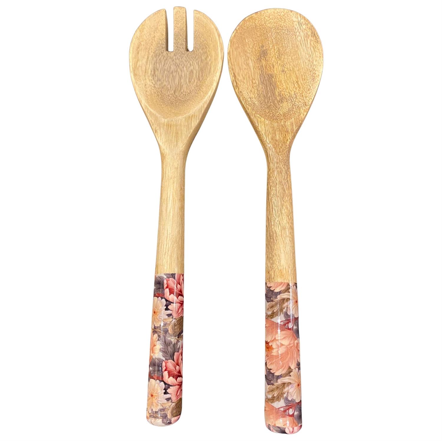 Das abgerundete Salatbesteck aus Mangoholz mit Blumen-Mustern ist die perfekte Ergänzung zu Ihrer Salatschale. Durch die hochwertige Kunststoffbeschichtung ist es lebensmittelecht und einfach in der Handhabung. Handwäsche wird empfohlen, da das Besteck nicht spülmaschinengeeignet ist.